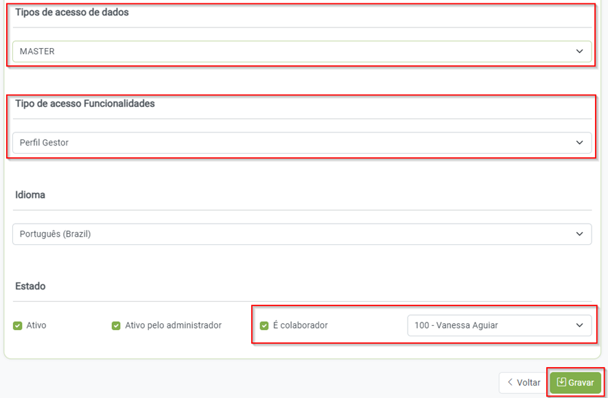 Como associar aos colaboradores o perfil de acesso e acesso a funcionalidades?