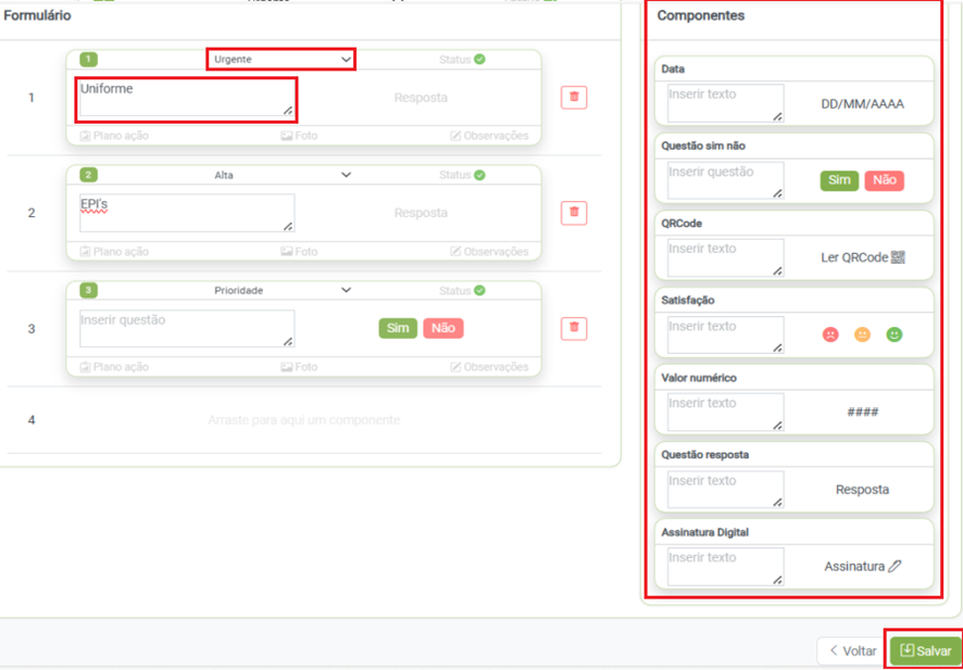 Escreva o descritivo do componente; Selecione o nível de prioridade