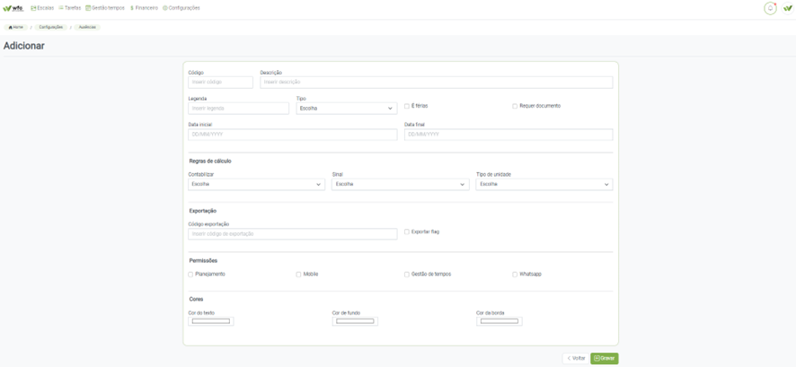 Código: inserir o código interno de ausência;Descrição: nome ausência;Legenda: legenda para a ausência, que seja fácil identificá-la ao selecionar na escala ou no pedido do colaborador;Tipo: qual o tipo da ausência;É ferias: quando a ausência for férias marque esse campo;Requer documento: quando a ausência deve ter um documento obrigatório, por exemplo: atestado médico, marque esse campo;Data inicial: data de início dessa ausência no sistema, podendo ser a data de início do projeto ou do início do ano;Data final: incluindo uma data final você estará inativando a ausência, ou seja, não será mais possível utilizá-la, caso contrário, deixe-a em branco;Regras de cálculo:Contabilizar: escolha como deve ser contabilizado a ausência;Sinal: escolha o sinal da ausência;Tipo de unidade: escolha a unidade da ausência.Exportação:Código exportação: código de exportação para a folha, por exemplo: código de ausência que vocês utilizam na contabilidade;Exportar flag: se a ausência deverá ser exportada marque esse campo.Permissões:Planejamento: a ausência ficará disponível para ser lançada no planejamento de escalas;Mobile: a ausência ficará disponível para ser lançada no aplicativo móvel;Gestão de tempos: a ausência ficará disponível para ser lançada na tratativas de ponto;WhatsApp: a ausência ficará disponível para ser lançada no WhatsApp.Cores: defina a cor da ausência que aparecerá na escala, facilitando a identificação rápida da mesma.