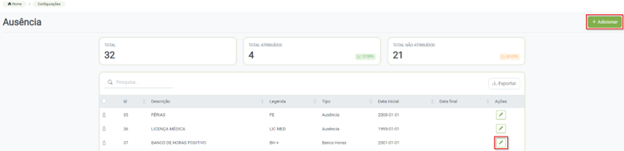 cadastros de ausências, é possível editar uma ausência clicando no lápis ao lado da ausência a ser editada, e se necessário