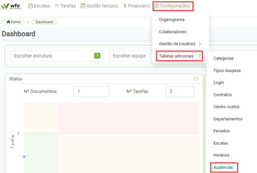 a) Clique em Configurações/Tabelas Adicionais/Ausências: