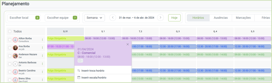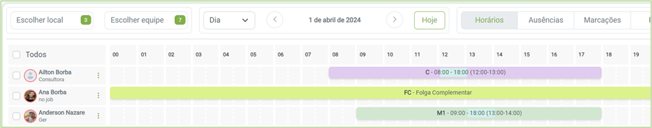 Visualização diária: Essa visualização mostra os horários de trabalho planejados para um dia específico. Ela permite uma visão detalhada dos horários de cada funcionário em um determinado dia.