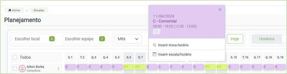 Para a alteração de escalas e horários é necessário clicar em Escalas/Planejamento e seguir as instruções a seguir: a) Para alteração de horário clicar no dia desejado e selecionar a opção Inserir troca horário: Após selecione o horário desejado e ...