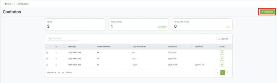 b) Nesta tela estará disponível todos os cadastros de contratos. Para a criação de um contrato clique em Adicionar: