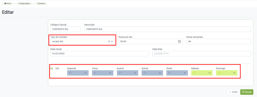 campo deverá selecionar um horário correspondente a carga horária diária/folga.