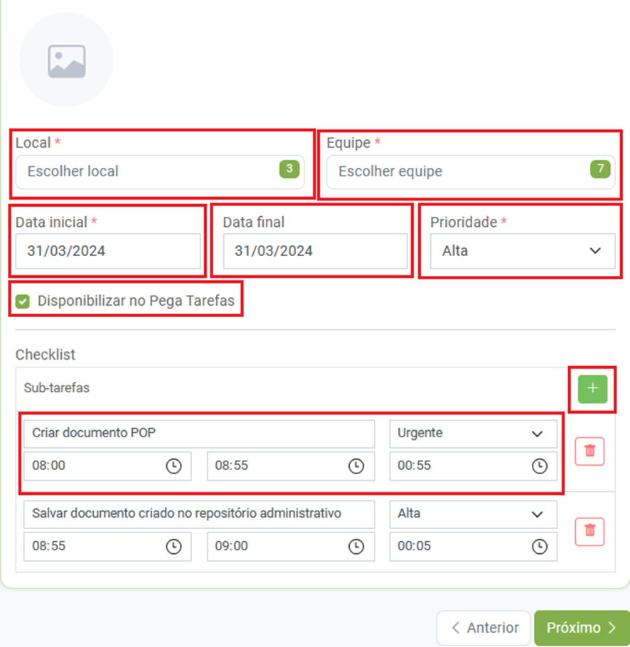 Clique no ícone “+” e, para cada subtarefa, informe: