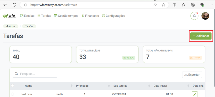 Clique no botão “Adicionar” para começar a criação da nova Tarefa.